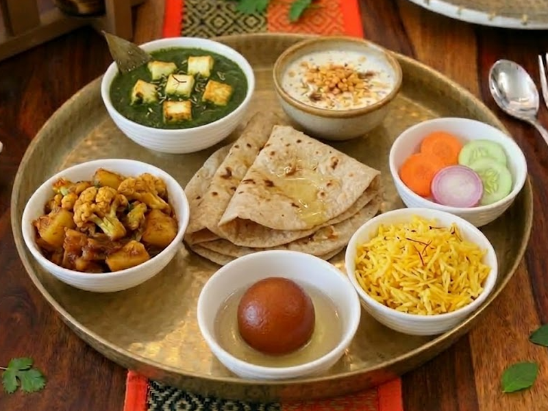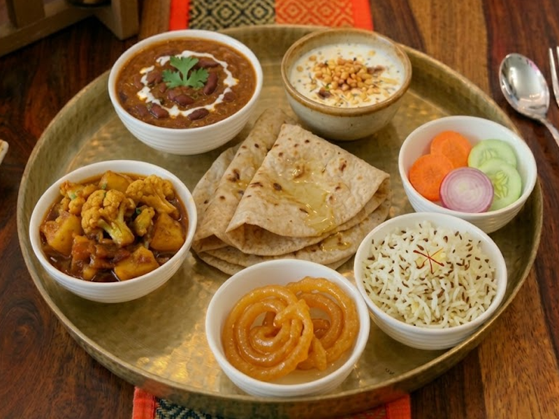 A wholesome North Indian platter featuring rich, creamy Butter Chicken paired with a comforting daily vegetable (Buddey Veg), served with your choice of freshly made roti, rice, salad , raita and mithai. A satisfying balance of indulgent flavors and homely goodness in every bite.